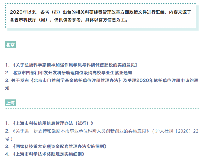 2020年以來,各省(市)出臺的相關科研經(jīng)費管理改革方面政策文件進行匯編,內(nèi)容來源于各省市科技廳(局),僅供讀者參考,具體以官方信息為主。北京1. 《關于弘揚科學家精神加強作風學風與科研誠信...